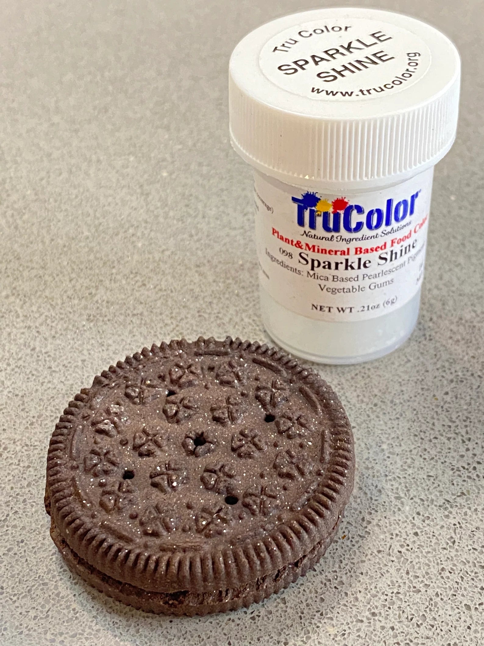Add sparkle to your designs without changing the color. Pictured airbrushed onto a dark cookie.