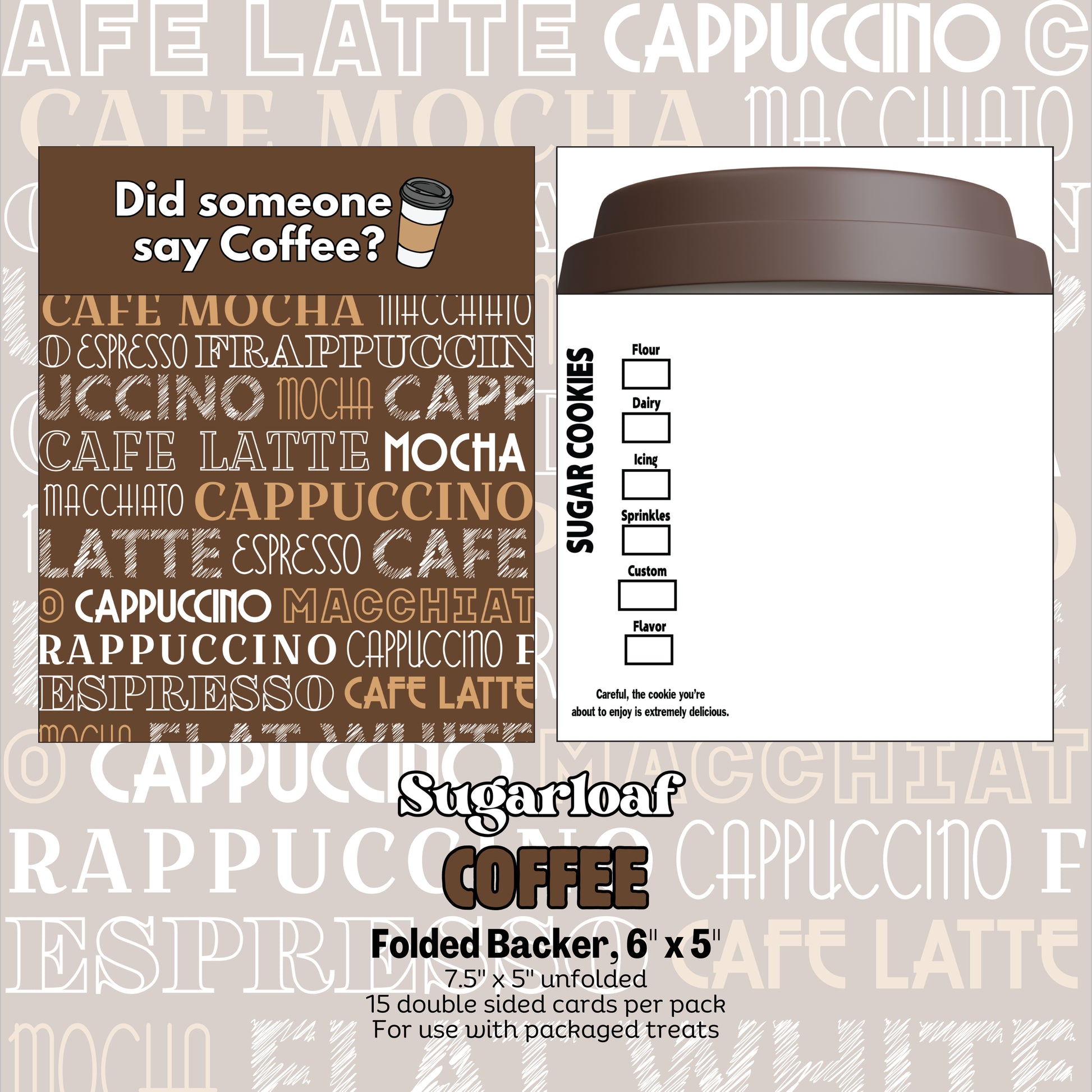 6" x 5" Folded Backer in "Coffee Word" Pattern with "Customized Cookie Coffee Cup" on the opposite side. The Coffee folded backer is a double sided card that is a great way to give coffee themed cookies as gifts!