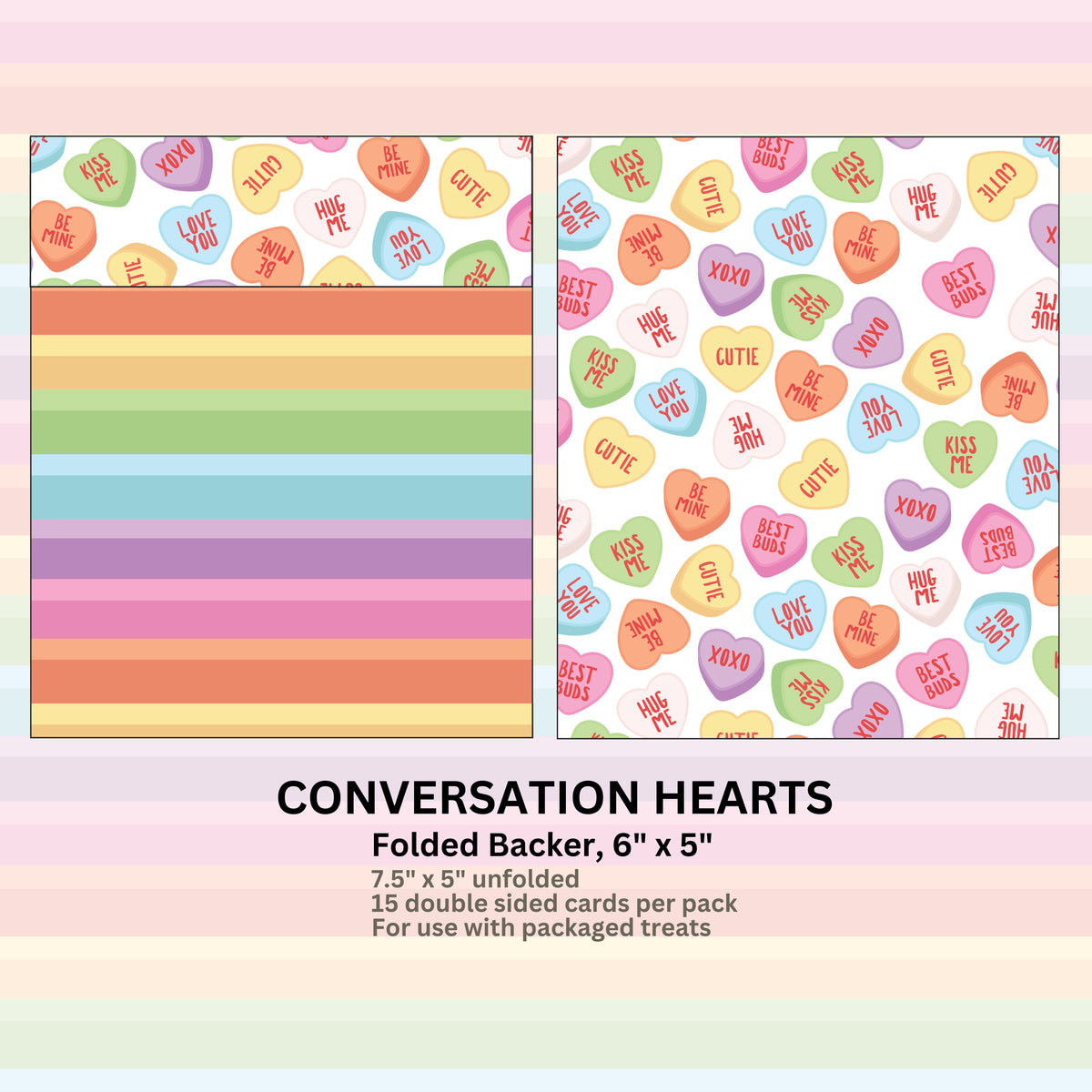 6" x 5" Folded Backer in "Conversation Hearts" Pattern with matching "Rainbow Stripes" on the opposite side.