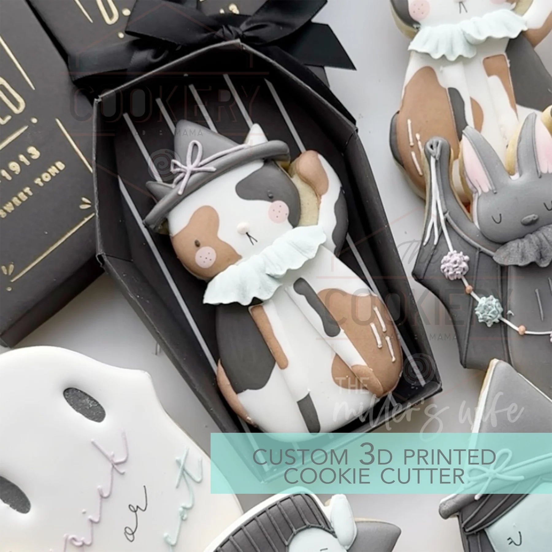 This cutter can be used alone or in a box set. If using in the coffin boxes as pictured (available here on our website: https://thecookiery.ca/products/mini-coffin-treat-boxes) or in a 12" x 5" bakery box, please opt for the 4.5" size.