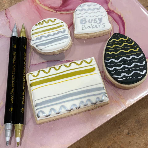 METALLIC edible ink markers. Perfect to use on Royal Icing, Fondant, Gumpaste. Store lying down flat for best use!