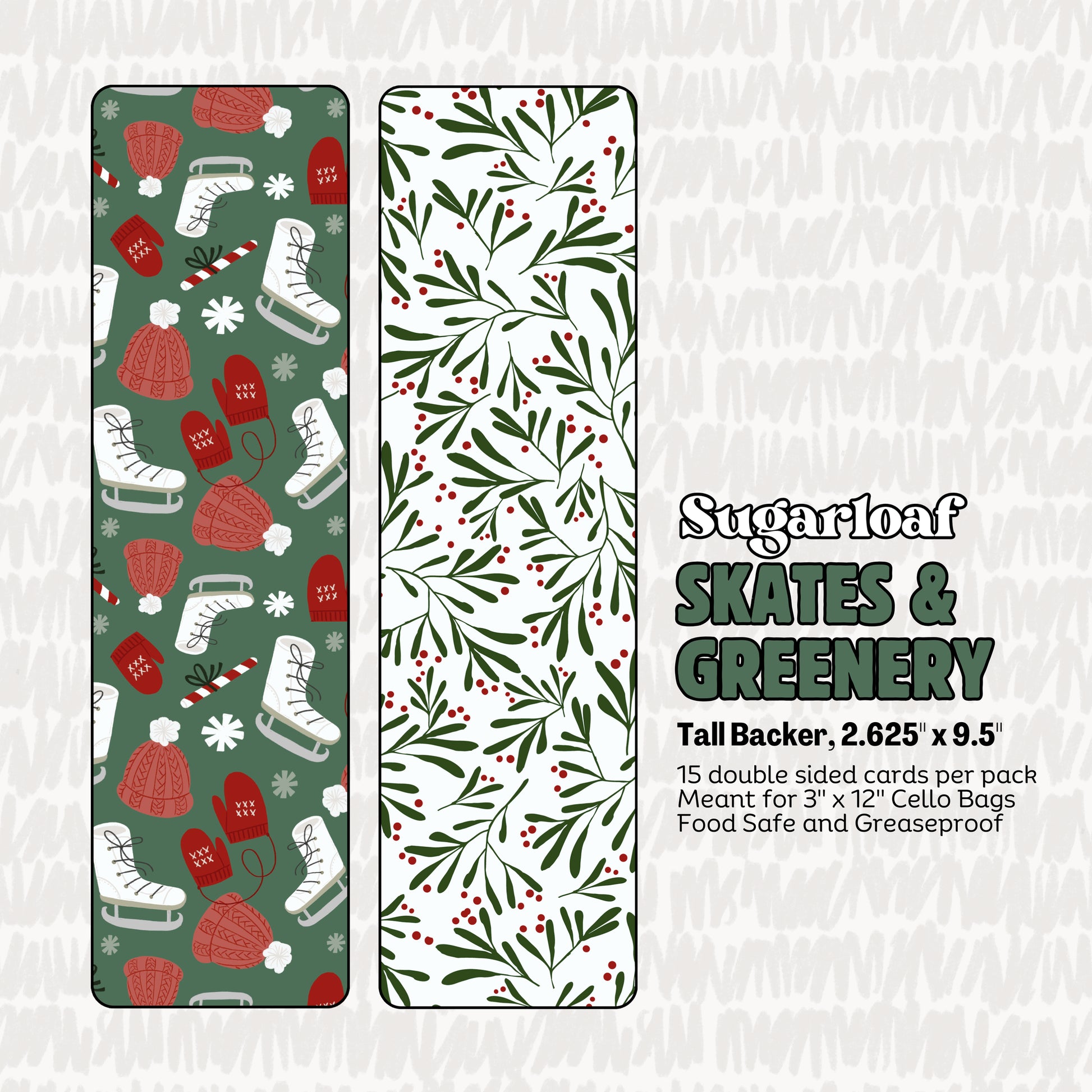 9.5" x 2.625" Tall Backers for Cookies or other small treats in "Skates" Pattern with "Greenery" pattern on the opposite side.